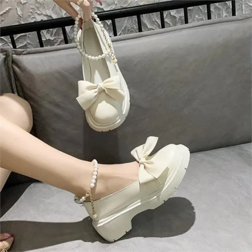 Our Pearl Charm Mary Jane Platform Flats redefine playful sophistication. These delightful cream-colored flats feature a classic Mary Jane silhouette with a comfortable chunky platform sole, offering a stylish lift and stable support. The front is gracefully accented with an oversized, soft bow, adding a touch of feminine charm. What truly sets this pair apart is the elegant pearl-beaded ankle strap, which adds a luxurious and whimsical detail. Perfect for special occasions, adding a unique flair to casual outfits, or enhancing a vintage-inspired ensemble, these women’s platform flats combine comfort with enchanting design for a truly distinctive look.