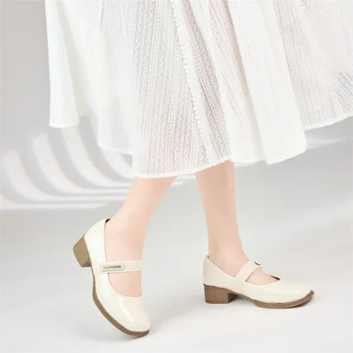 Timeless elegance defines these cream-white Mary Jane pumps, featuring a comfortable block heel and a sleek, patent finish.